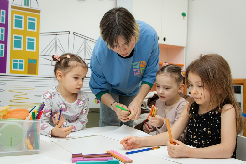 Занятия проводит педагог-логопед. Это обучение чтению, подготовка руки к письму, развитие речи. Также дети знакомятся с основами математики, окружающим миром, выполняют упражнения на развитие логики, внимания и мышления.